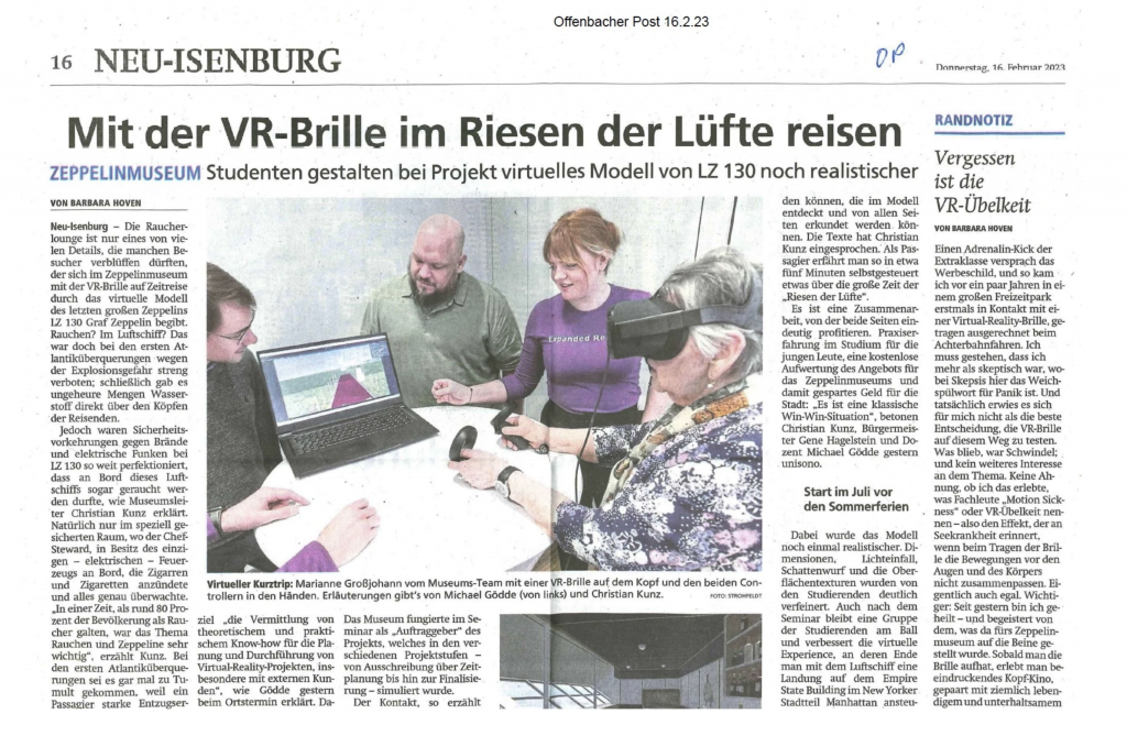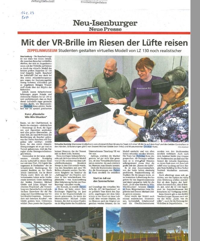 This project was very unique to me as it was the first project where I was able to work in very close contact with an established client, the Zepelinmuseum in Zepelinheim. The museum reached out to our course in cooperation with our lecturers and offered us a tender with three lots. As a group we were then tasked with creating an elaborate pitch with a storyline for a tour through the last zepelin airship, the LZ130. Together we pitched our concept proudly and with the clients approval got to work. Throughout the project we were confronted with management tactics such as risk management and effecive client communication and in turn were immediately able to put these new skills to use in the project. Bt the most exciting part f the project was being able to reach and excede the expectations of our client.