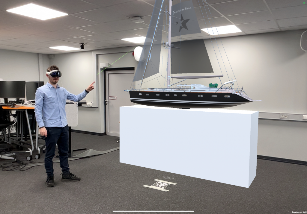 Understanding complex, invisible systems, such as a yacht’s power grid or communication networks, can be overwhelming for new buyers. For my Bachelor thesis in Expanded Realities at Darmstadt University of Applied Sciences, I developed a multiplayer Mixed Reality (MR) application for the Apple Vision Pro. Designed for boat shows like the “BOOT” in Düsseldorf, the experience enables groups of 2 to 5 participants to collaboratively explore a sail yacht’s technical features, guided by a moderator.