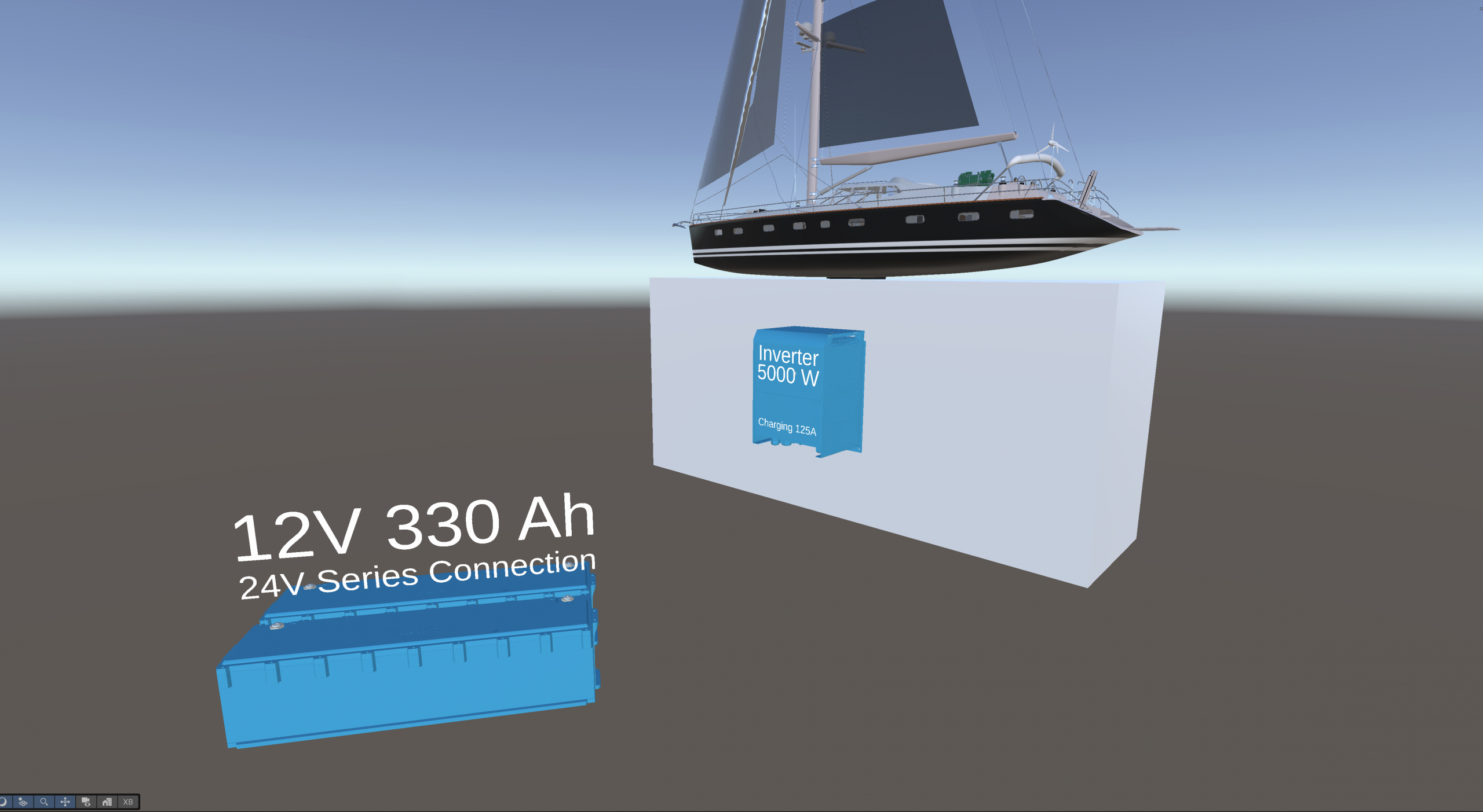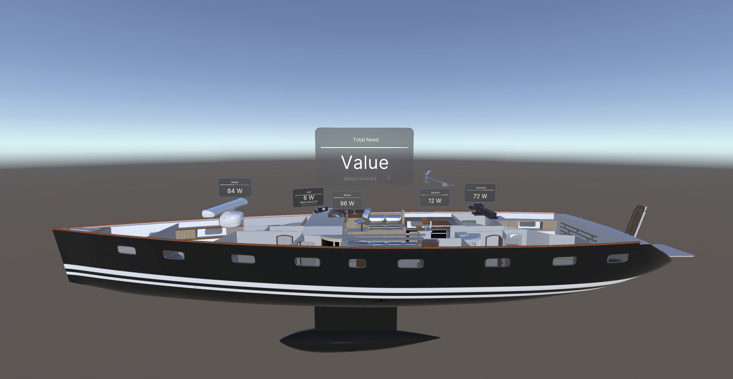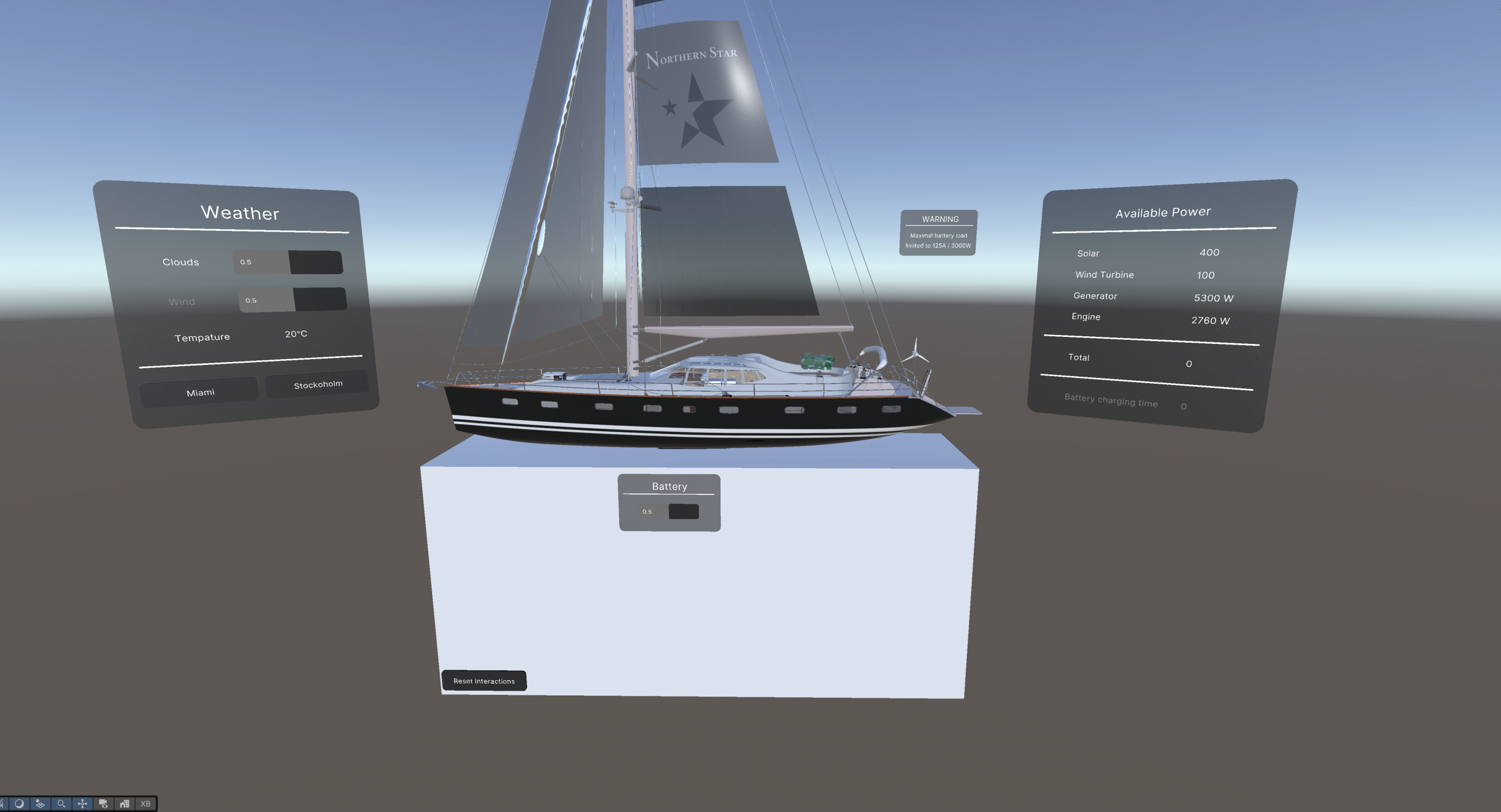 - Interactive Dioramas & Weather Simulation: Users can manipulate sliders for cloud coverage and wind speed. They instantly see the real-time impact on the yacht’s solar panels and wind turbines. This helps them learn how to balance green energy with combustion engines.