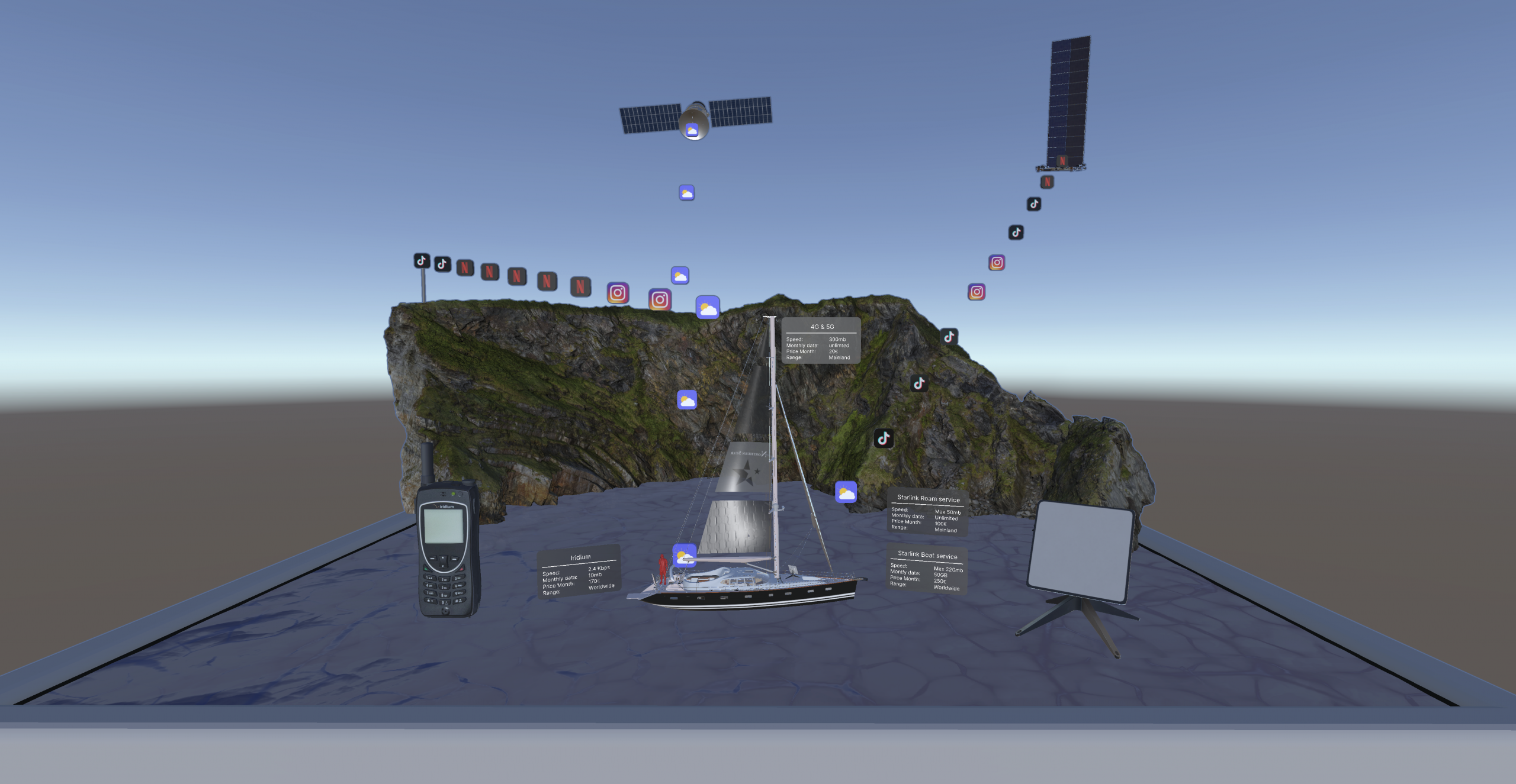 - Network Visualizations: Abstract concepts like NMEA 2000 data flows and satellite internet bandwidths are visualized through animated data packets and coverage dioramas.